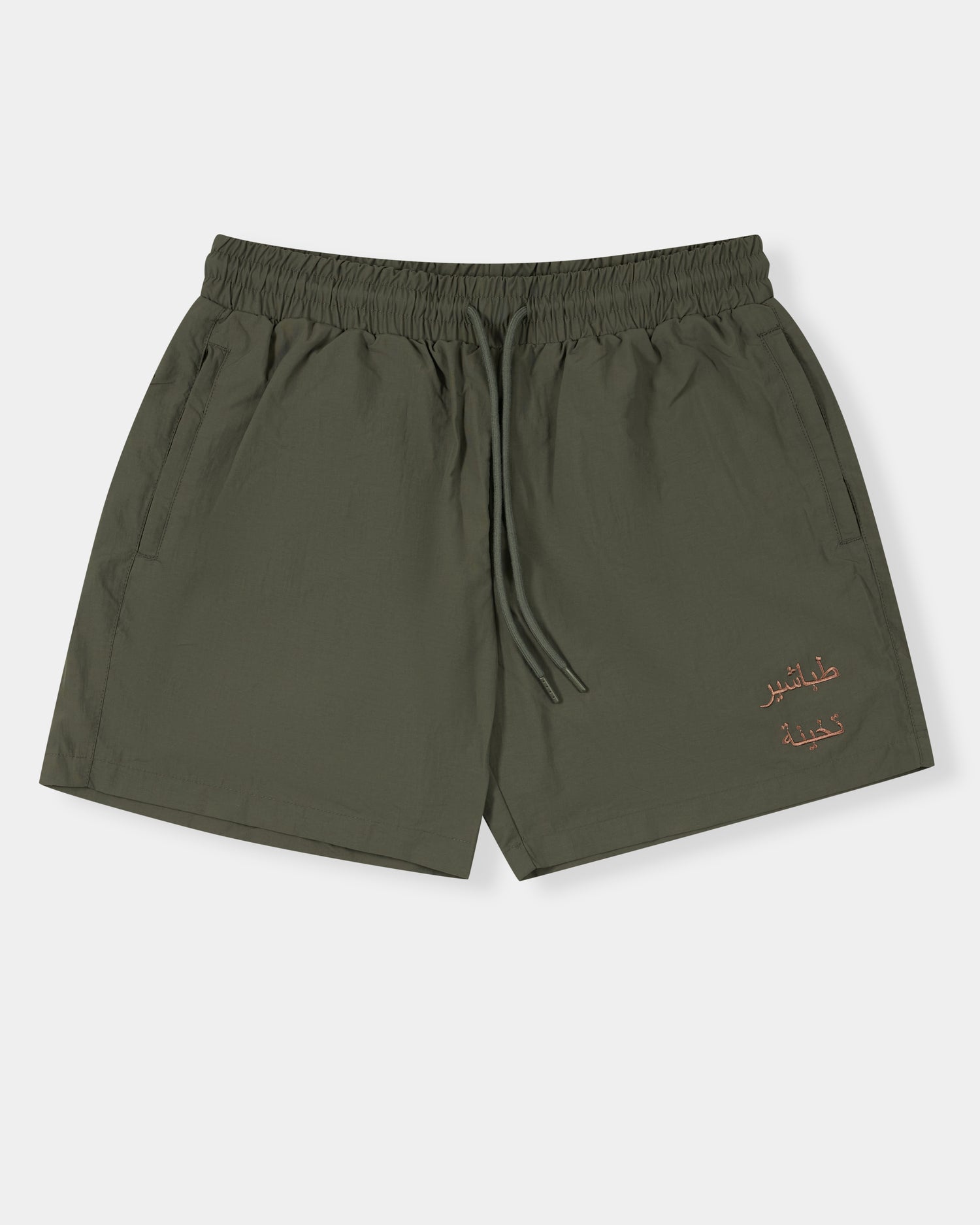 The 100% nylon-polyester fabric construction along with our custom fit ensures a cosy fit. The Arabic Textual Logo is featured in a Forest Brown colour. Both side and back pockets offer easy storage options so you're ready to go all summer.
